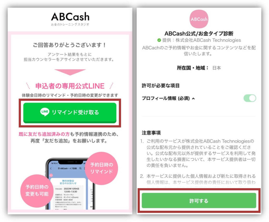 「リマインドを受け取る」→「許可する」の順にタップして、ABCashを友だちに追加してください🤍