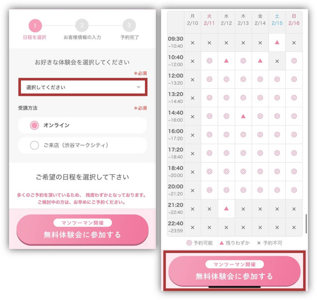 次に希望の日時を選択して「無料体験会に参加する」をタップしましょう🤍