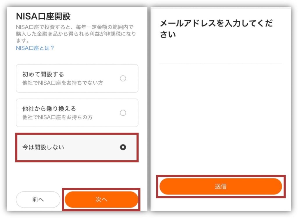 NISA口座を開設するかを選び「次へ」をタップ。