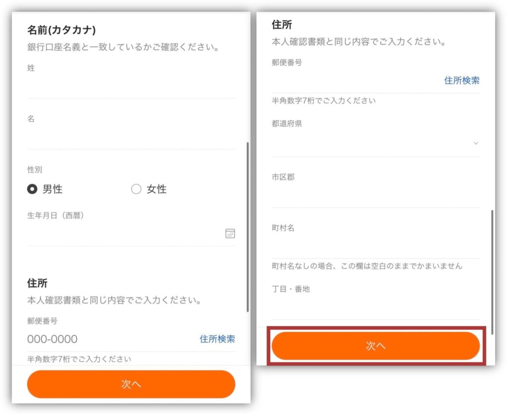 名前や住所などを入力して「次へ」をタップします。