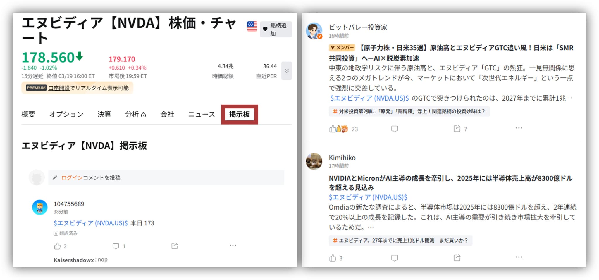 投資家の意見やAI分析が見られる