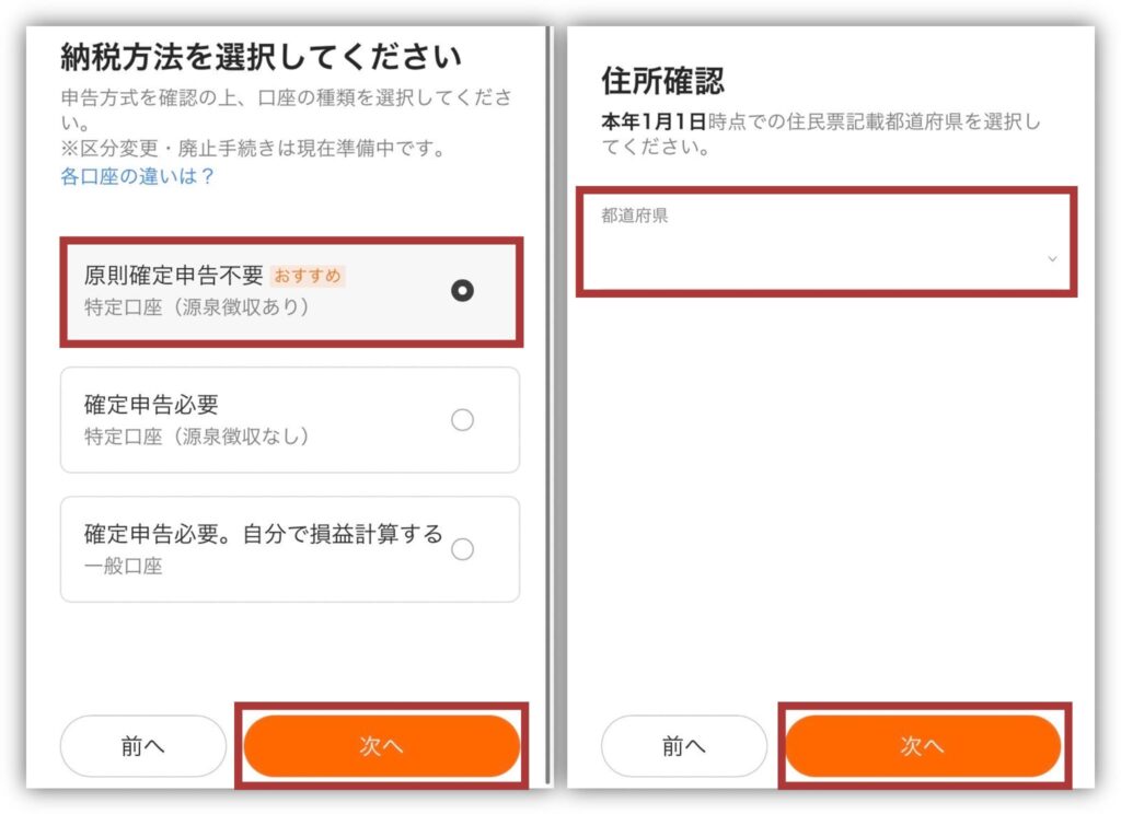 住所確認では、口座開設する年の1月1日時点で居住していた都道府県を選択して「次へ」に進んでください🙇♀️