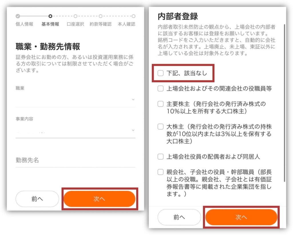 内部者登録では「下記、該当なし」にチェックを入れて、「次へ」をタップ。
