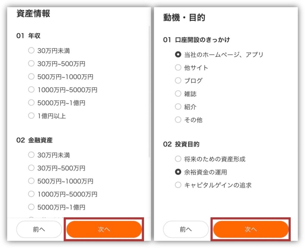 続いて、資産情報や投資目的なども答えて「次へ」をタップします!