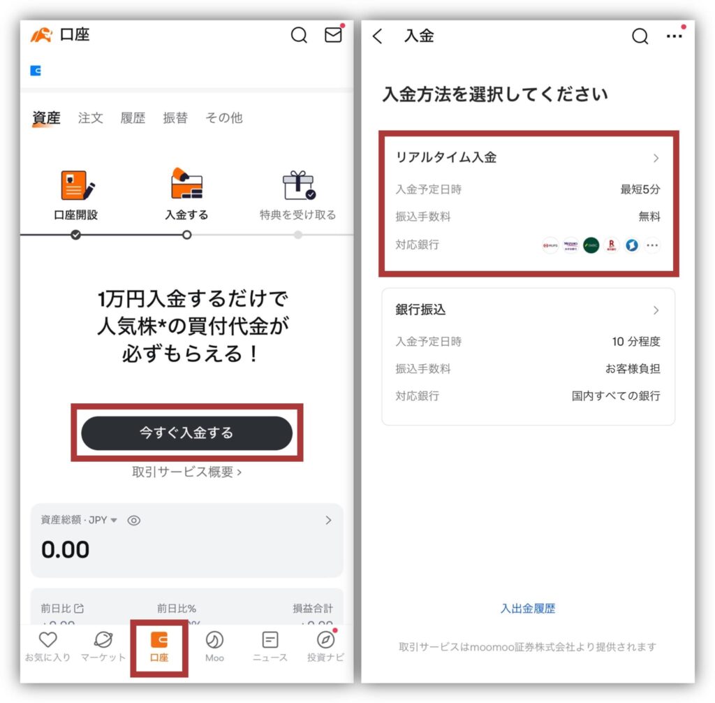 moomooのアプリを開き、「口座」→「今すぐ入金する」の順でタップ。