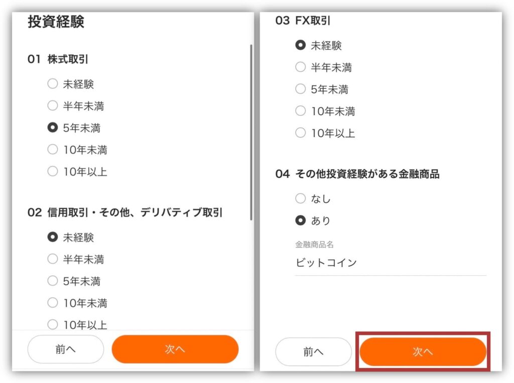 投資経験についても答えたら「次へ」へ進みましょう💕