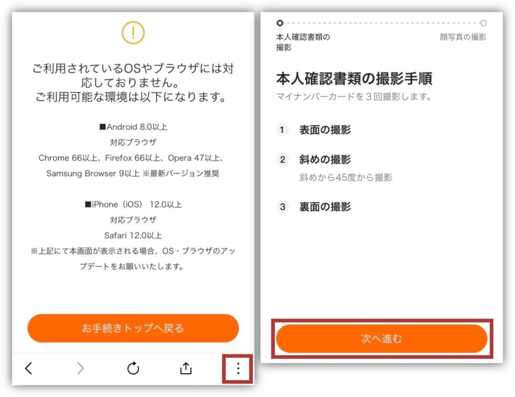 「ご利用されているOSやブラウザには対応しておりません」と表示されたら、画面下の「︙」をタップして外部ブラウザで開きましょう。