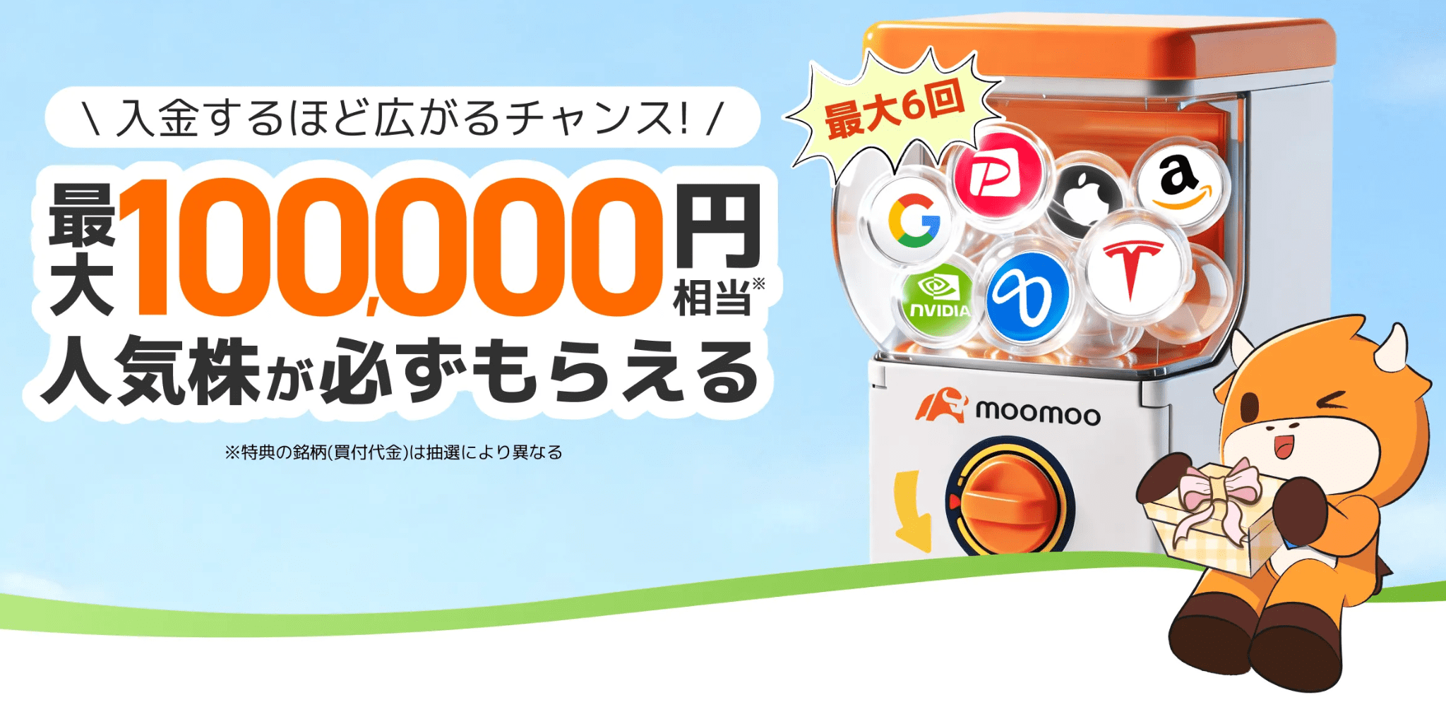 現在moomoo証券では、入金額に応じて「抽選券」が配られ、最大10万円相当の人気株がもらえるオトクなキャンペーンをしています💡