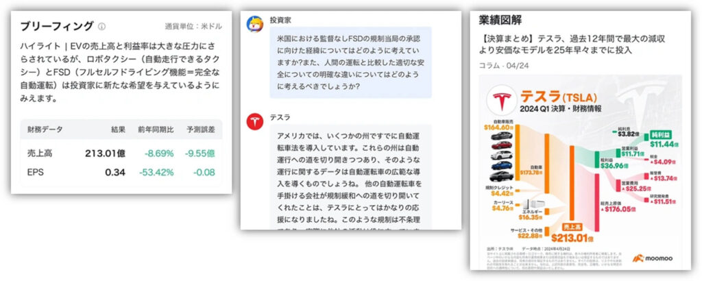 特に米国株はより情報が詳細で、チャット形式での決算説明会の質疑応答や業績の図解など、視覚的にサポートしてくれるのが特徴です!